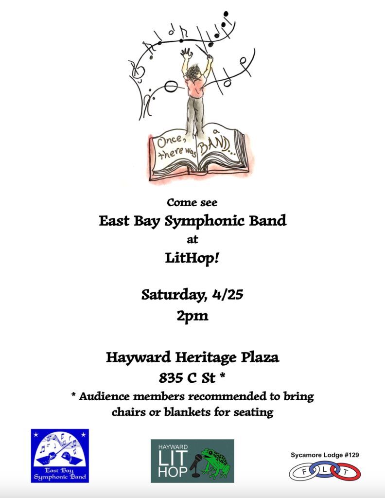 The Hayward Lit Hop happens again in April 2026! See their website here: https://www.haywardlithop.com/ The East Bay Symphony Band kicks off the festivities for the day, playing at 2 pm at the Heritage Plaza park across from the Library.