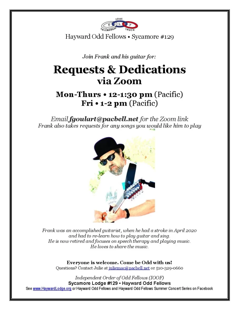 Sycamore Member Frank Goulart continues to recover from his 2020 stroke, but he still plays guitar – and he invites everyone to a weekly “Request & Dedications” Zoom social on every Monday through Thursday at 12-1:30pm and Fridays 1-2pm. (Pacific time). Come to talk and laugh and enjoy some music and friendship. Bring your harmonica or other instrument, or sing along! If you would like to get on his email list so you get the the Zoom link, email Frank at fgoulart@pacbell.net . Let him know requests for any songs you would like him to play.